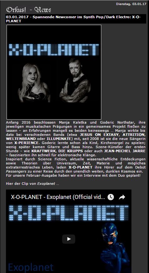 Hallo liebe Freunde von X-O-Planet! In der aktuellen Ausgabe des Orkus-Magazins könnt ihr ein Interview sowie eine Rezension zu unserem Album „Passengers“ lesen. Passend dazu spendieren wir euch als Kostprobe den Titelsong zu unserem Album…