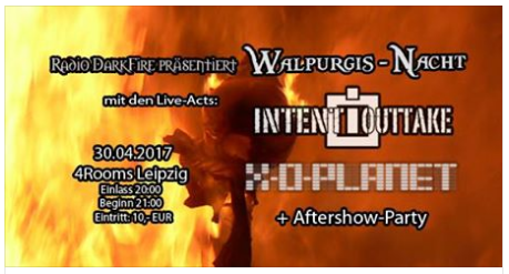30.04.2017 20:00 UHR Schwarze Walpurgisnacht im 4Rooms Leipzig mit den Live-Acts INTENT:OUTTAKE und X-O-PLANET + Aftershow-Party Eintritt: 10,00 € ————————–——————- Am 30. April spielen Intent:Outtake (Leipzig) ihre charakteristische Interpretation des Dark Electro (wobei auch einige…