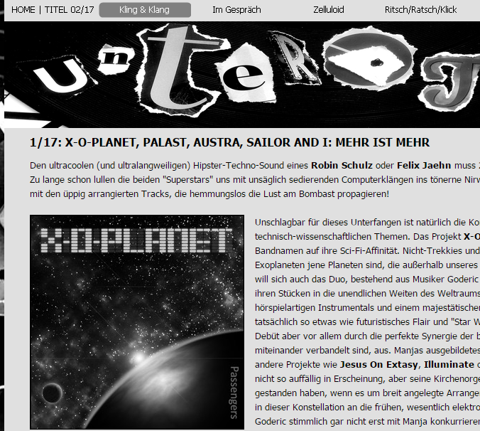 Hallo liebe Freunde von X-O-Planet! In der aktuellen Ausgabe des Orkus-Magazins könnt ihr ein Interview sowie eine Rezension zu unserem Album „Passengers“ lesen. Passend dazu spendieren wir euch als Kostprobe den Titelsong zu unserem Album…